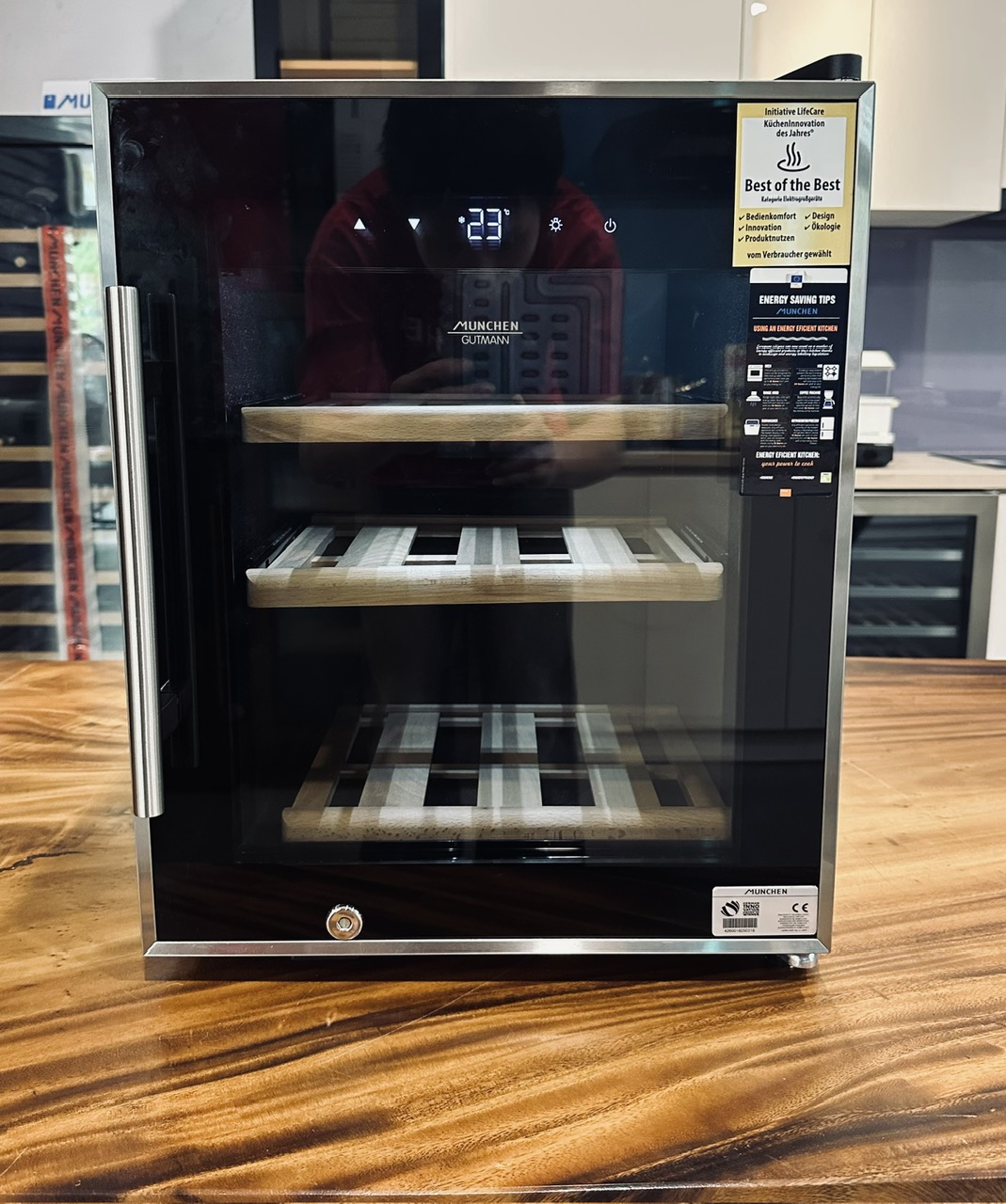 Kiểu dáng thiết kể tủ rượu vang Munchen đẳng cấp với viền trước và tay nắm trên cửa tủ được làm bằng chất liệu thép cao cấp, an toàn cho người sử dụng.